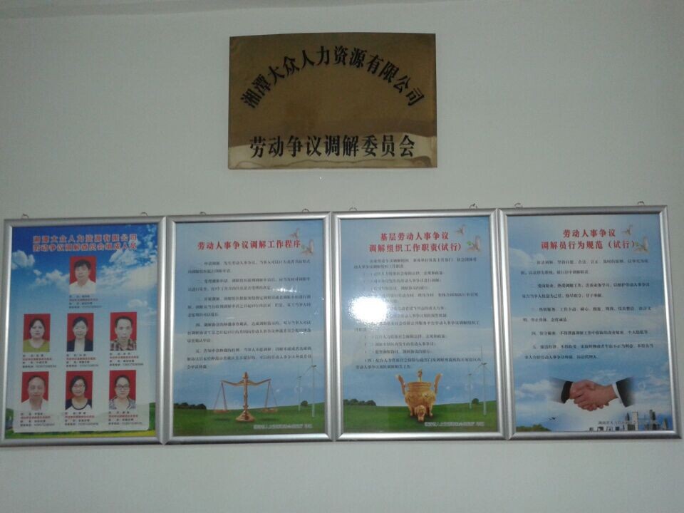 為了規(guī)范勞動(dòng)人事爭議預(yù)防調(diào)解處理工作,維護(hù)社會(huì)和諧穩(wěn)定,按照潭人社發(fā)【2014】29號(hào)文件要求,根據(jù)《中華人民共和國勞動(dòng)爭議調(diào)解仲裁法》等法律法規(guī)精神,湘潭大眾人力資源有限公司于2014年6月13日調(diào)整規(guī)范了勞動(dòng)爭議調(diào)解委員會(huì),并對(duì)委員會(huì)成員、工作程序、工作職責(zé)、行為規(guī)范進(jìn)行了上墻公示。