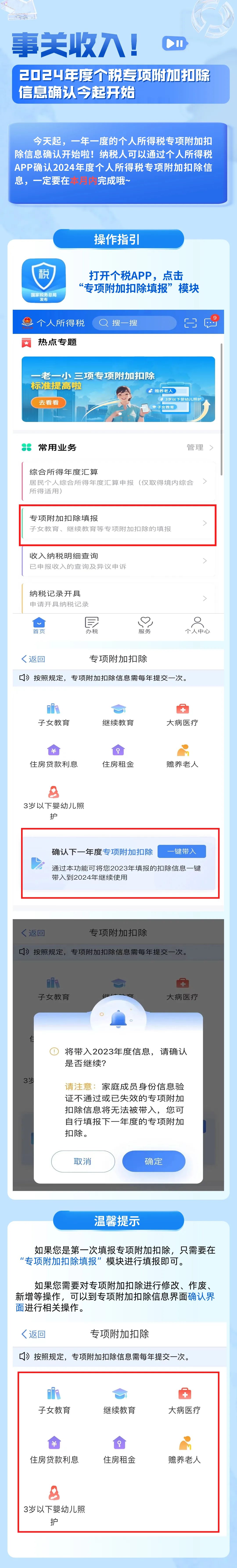 今天起,一年一度的個人所得稅專項附加扣除信息確認開始啦!納稅人可以通過個人所得稅APP確認2024年度個人所得稅專項附加扣除信息,一定要在本月內(nèi)完成哦~